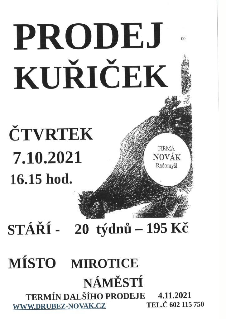 Firma Novák Radomyšl přijede na náměstí v Miroticích prodávat kuřičky. Prodej proběhne ve čtvrtek 7. října v 16:15 hodin.