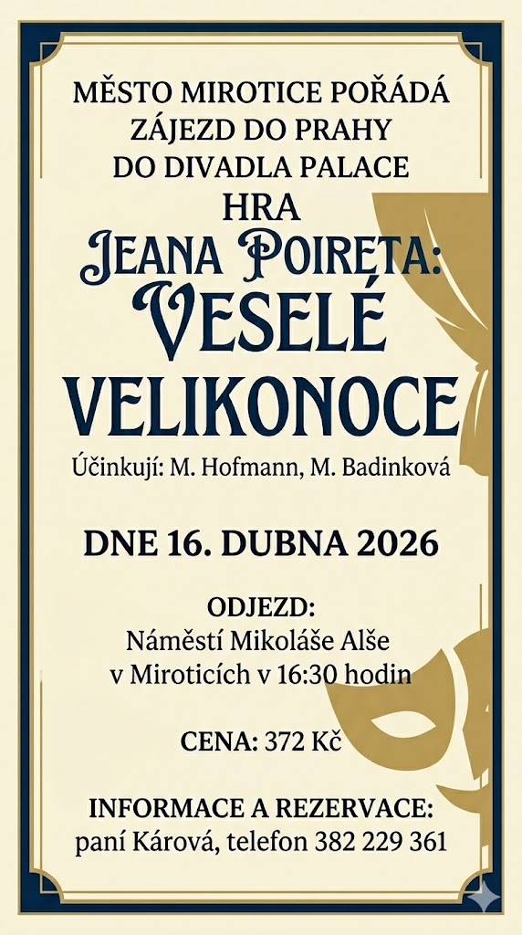 Město Mirotice pořádá zájezd do Prahy, kde navštívíte divadlo Palace. Tato akce se uskuteční 16. dubna 2026 a odjezd je naplánován na 16:30 z náměstí Mikoláše Alše v Miroticích. Účinkují známí herci M. Hofmann a M. Badinková. Před odjezdem je doporučeno provést rezervaci.